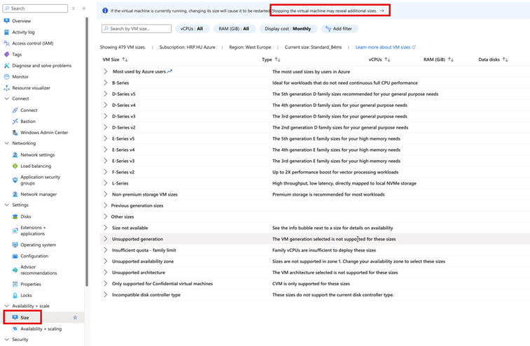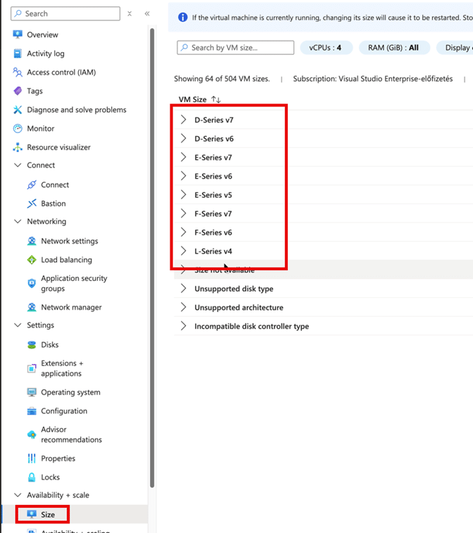 Gyakran szembesülünk azzal, hogy szeretnénk gép méretet váltani, de sajnos a VM Size menüpontban nem tudom kiválasztani ezeket az új gépeket: